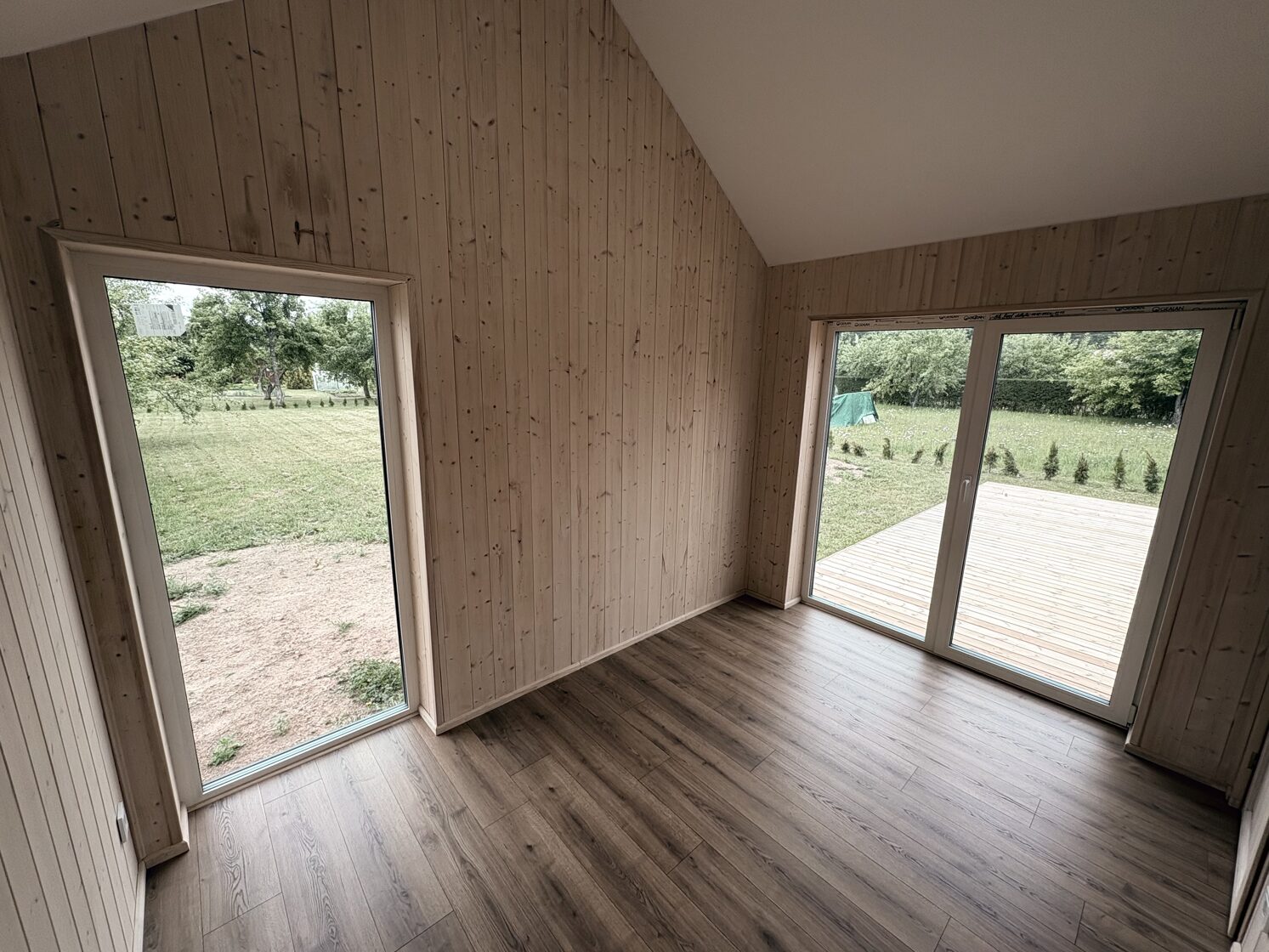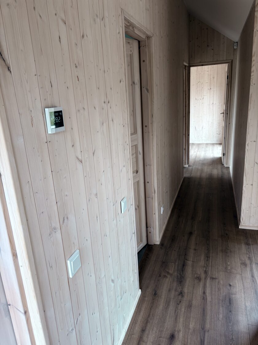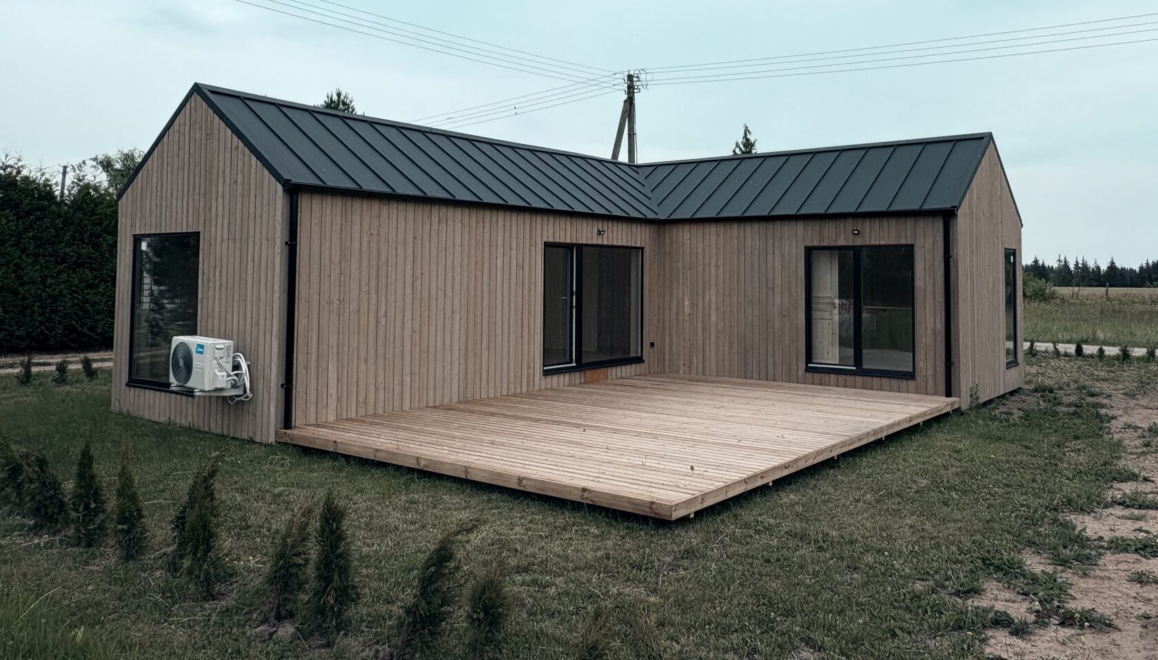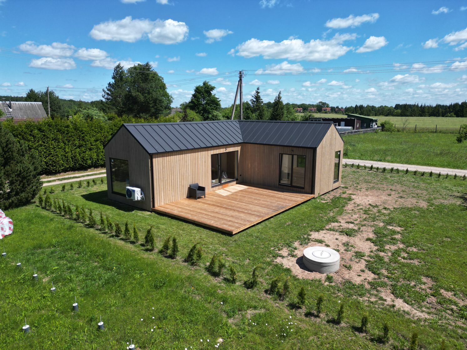 50 m² L formos karkasinis namas pastatytas Začišių kaime, Kauno rajone. Vidaus sienų apdaila – balintos medinės dailylentės, įtempiamos lubos, grindų danga – hibridinė. Projektas sukurtas patogiam ir energiškai efektyviam gyvenimui.