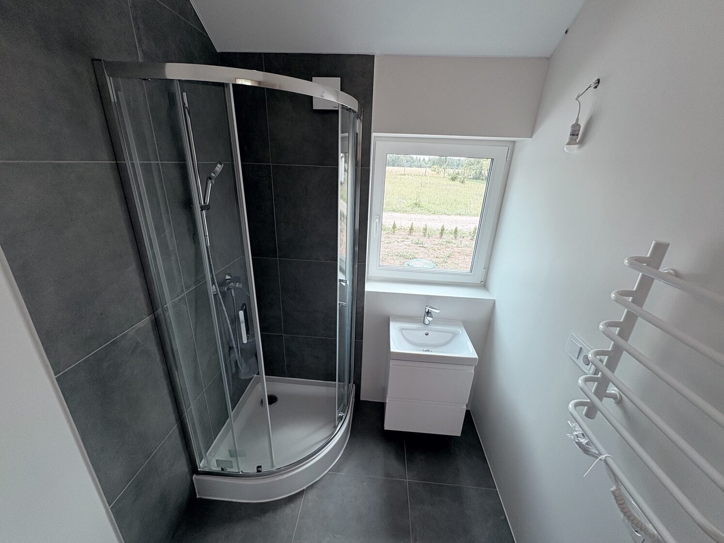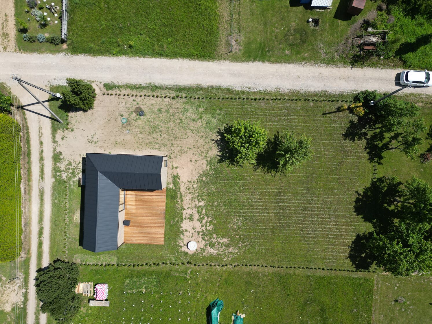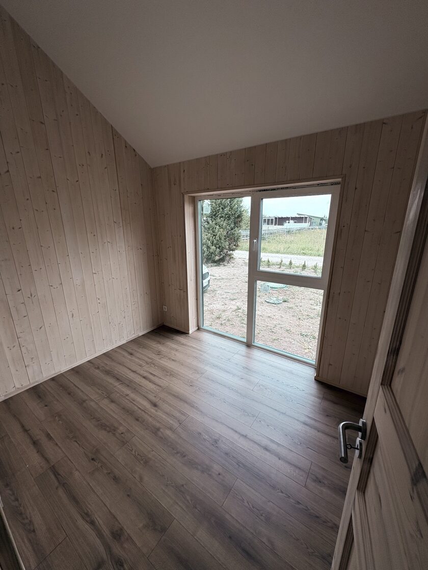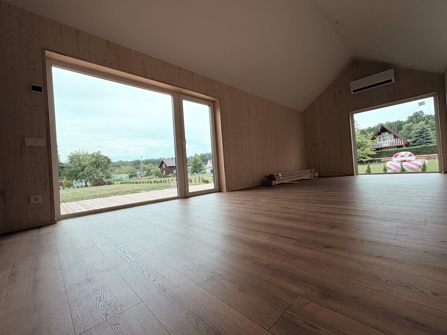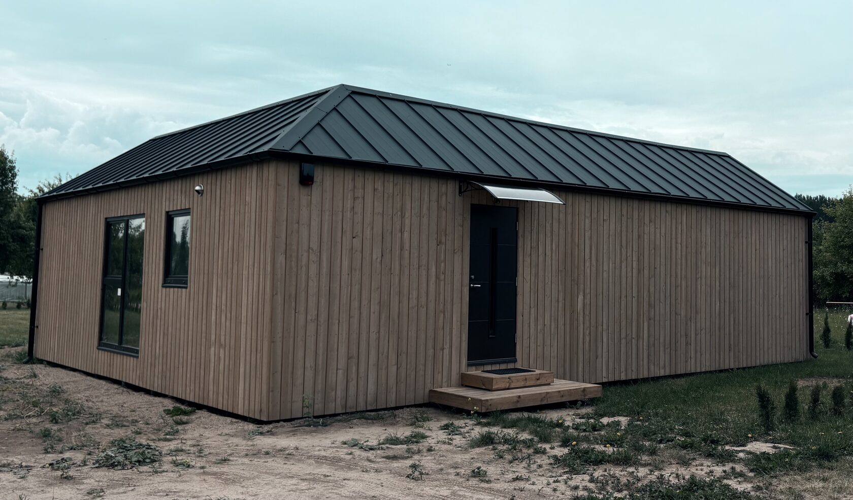 50 m² L formos karkasinis namas pastatytas Začišių kaime, Kauno rajone. Vidaus sienų apdaila – balintos medinės dailylentės, įtempiamos lubos, grindų danga – hibridinė. Projektas sukurtas patogiam ir energiškai efektyviam gyvenimui.